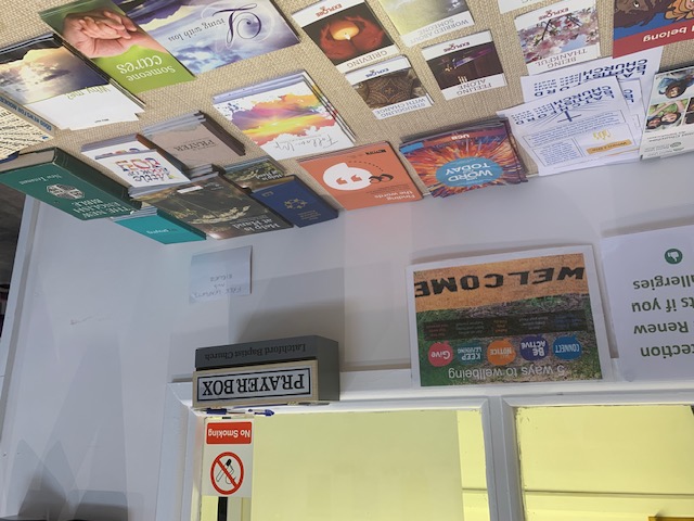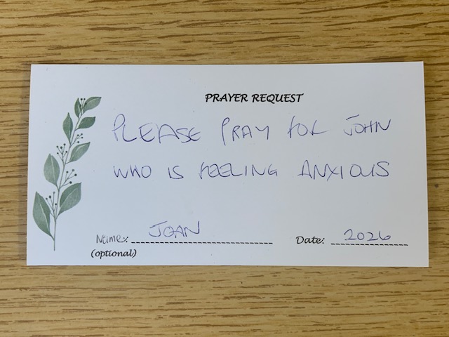 We have a prayer box and cards on which requests can be made before placing them in the box. The request cards and prayer box can be found in the Hub above the table on the left as you enter through the door.
